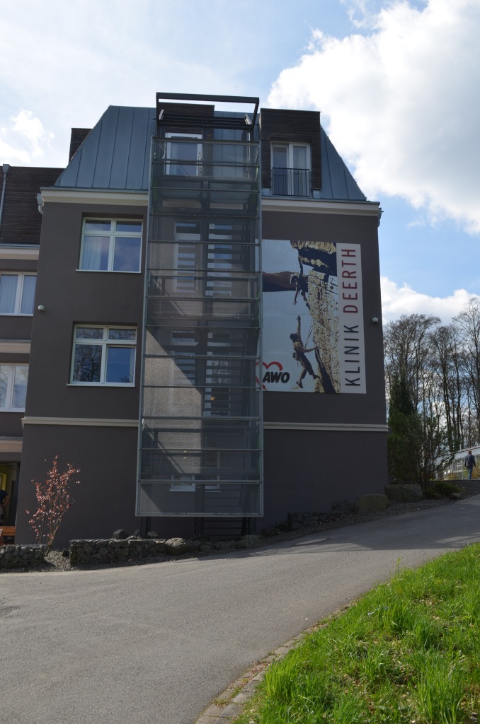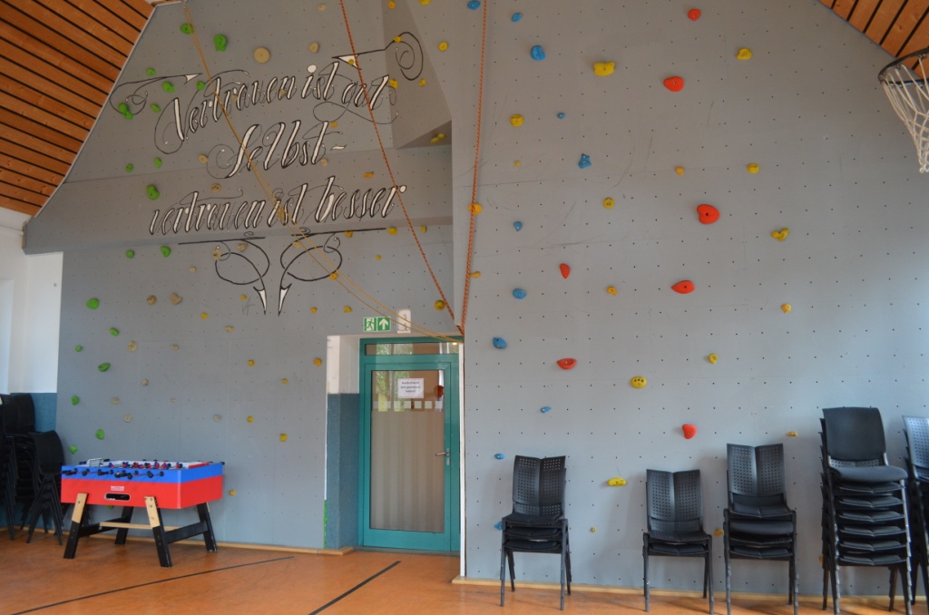 Unsere Einrichtung ist baulich nicht gesichert, die Patienten dürfen sich auf dem Klinikgelände frei bewegen. Im Mittelpunkt des 10.000 qm großen Anwesens steht das Klinikgebäude mit einer kleinen Sporthalle, die mit einer Kletterwand für Freeclimbing ausgestattet ist.