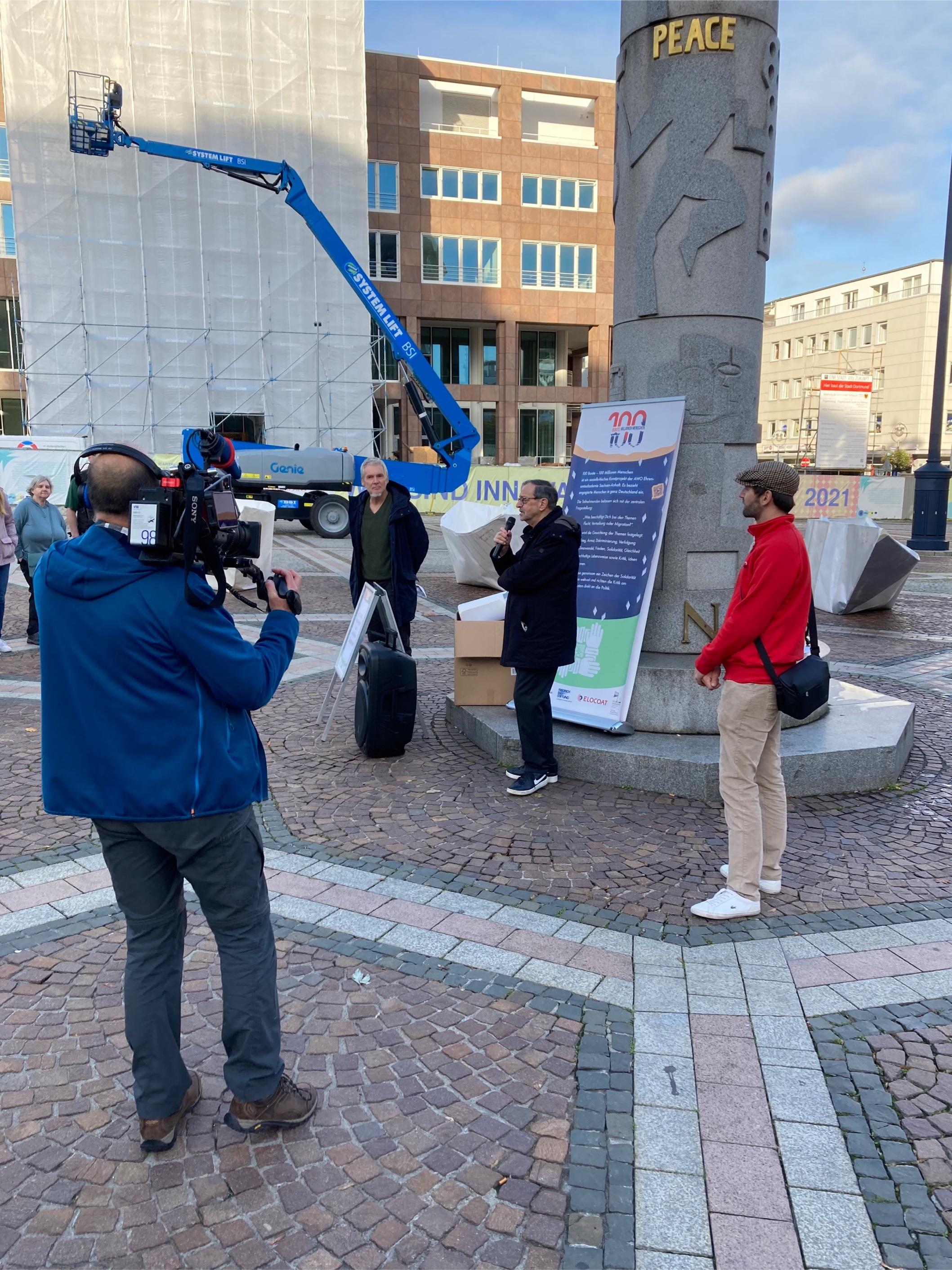 Foto: AWO-Bezirksvorsitzender Michael Scheffler (m.), Papierkünstler Frank Bölter (li.) und Projektkoordinator Ruben Herm beim Start der Aktion auf dem Dortmunder Friedensplatz.