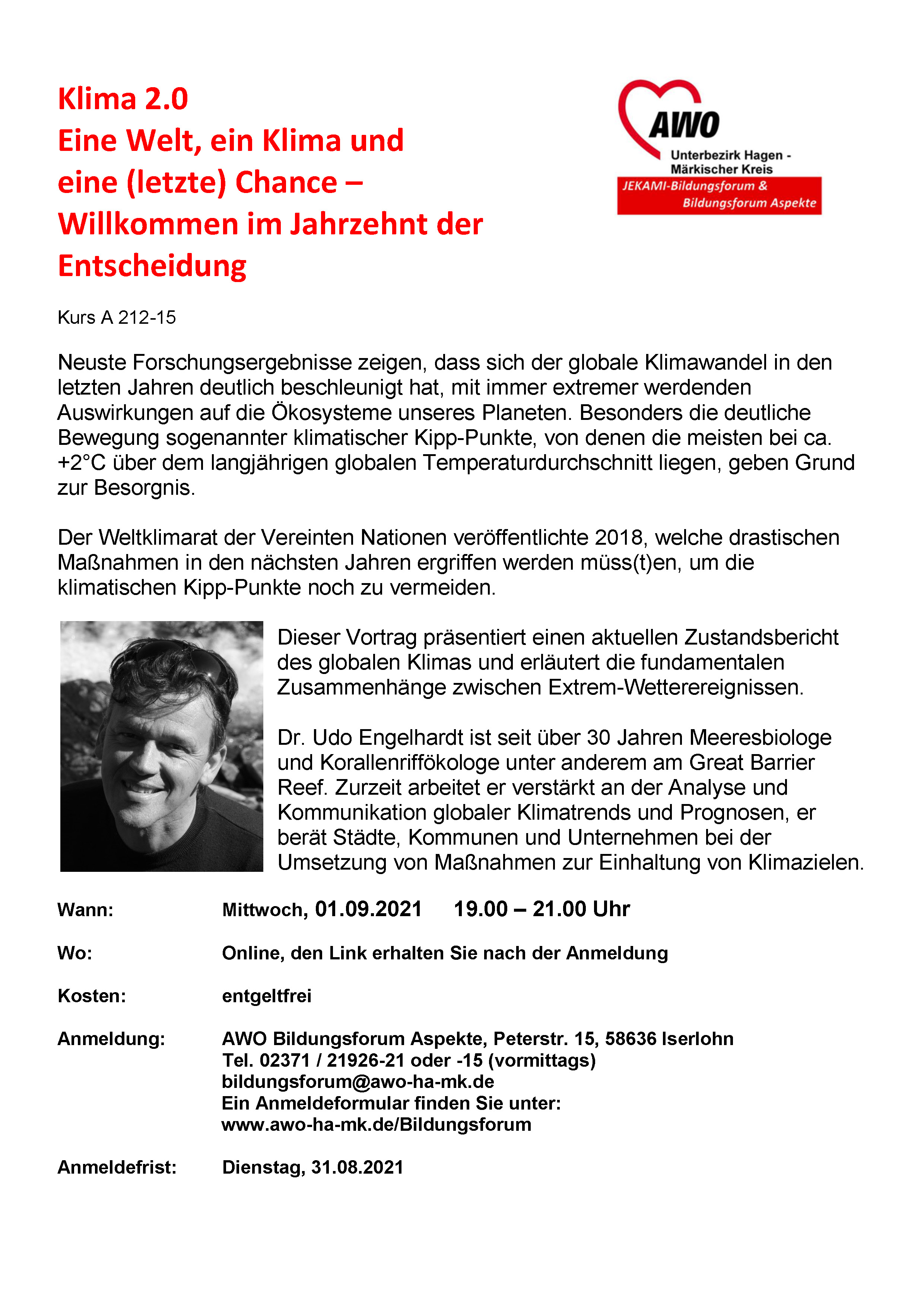 Die Auftaktveranstaltung ist ein Online-Vortrag von Dr. Udo Engelhardt mit dem Thema „Eine Welt, ein Klima und eine (letzte) Chance – Willkommen im Jahrzehnt der Entscheidung“ am Mittwoch, 01.09.21 um 19.00 Uhr. Dr. Engelhardt ist seit 30 Jahren Meeresbiologe und Korallenriffökologe und hat viele Jahre u.a. im australischen Great Barrier Reef die dramatischen Veränderungen erforscht. Auf der Grundlage seiner Beobachtung und Erfahrung präsentiert er einen aktuellen Zustandsbericht des globalen Klimas. Dr. Engelhardt erläutert die fundamentalen Zusammenhänge zwischen Extrem-Wetterereignissen und macht deutlich, was wir dringend tun müssen, um eine Klimakatastrophe in letzter Sekunde doch noch abzuwenden.