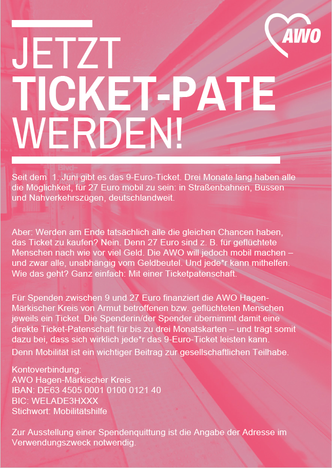 Für Spenden zwischen 9 und 27 Euro finanziert die AWO Hagen-Märkischer Kreis von Armut betroffenen bzw. geflüchteten Menschen jeweils ein Ticket. Die Spenderin/der Spender übernimmt damit eine direkte Ticket-Patenschaft für bis zu drei Monatskarten – und trägt somit dazu bei, dass sich wirklich jede*r das 9-Euro-Ticket leisten kann.