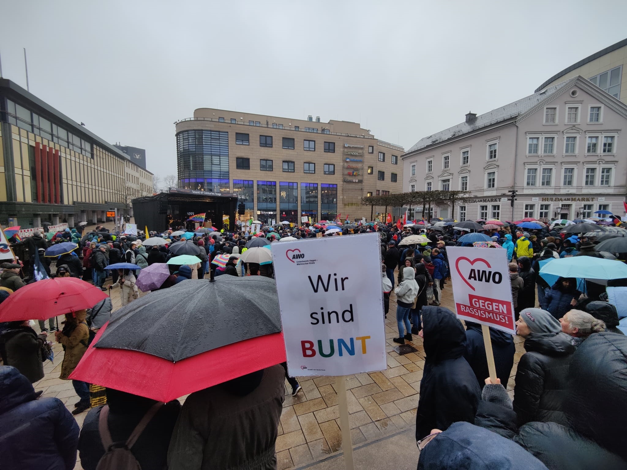 Unter dem Motto „Aufstehen für die Demokratie“ hatte am Samstag (03. Februar) die ehemalige Bundestagsabgeordnete Petra Crone zur Demo auf dem Lüdenscheider Sternplatz aufgerufen. Unter den ca. 1500 Demonstrierenden nwaren neben Privatpersonen auch viele Einrichtungen, Vereine, Parteien und Verbände dem Aufruf gefolgt. Auch die Mitarbeiter*innen und Ehrenamtlichen AWO setzten ein starkes Zeichen gegen rechts. Auf dem Otto-Fuchs-Platz in Meinerzhagen kamen am 1. Februar über 600 Menschen zu einer Mahnwache. Mitinitiator und AWO-Ortsvereinsvorsitzender Rolf Puschkarsky begrüßte die Teilnehmenden: "Eigentlich sind wir viel zu spät. Eigentlich hätten wir uns früher aufstellen müssen. Das war sicherlich ein Fehler. Aber heute sind wir hier um zu sagen : Wirt wollen euch nicht , wir wollen euch nicht ,ihr Rechten, und wir wollen euch nicht, ihr Brunnenvergifter."