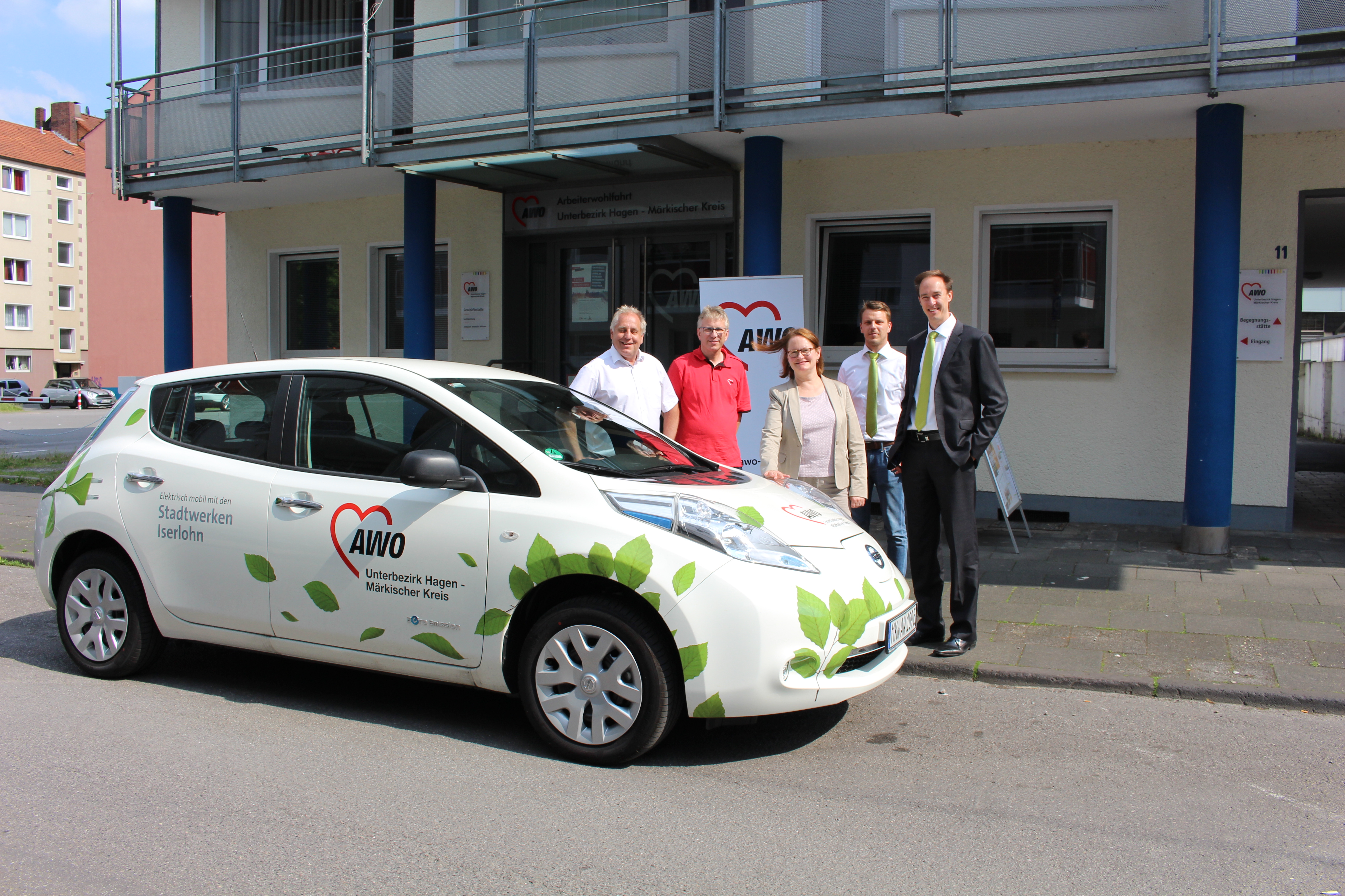 Bereits seit Ende März nutzt der AWO-Unterbezirk Hagen-Märkischer Kreis mittlerweile ein Elektrofahrzeug, das von den Stadtwerken Iserlohn für 3 Jahre zur Verfügung gestellt wird. Nach einer ersten Erprobungsphase wurde der Nissan Leaf nun auch offiziell von Dominik Neswadba, Bereichsleiter Vertrieb, und Thomas Stoltmann, Abteilungsleiter Vertrieb Sondervertragskunden, von den Stadtwerken Iserlohn an AWO-Geschäftsführerin Birgit Buchholz übergeben.