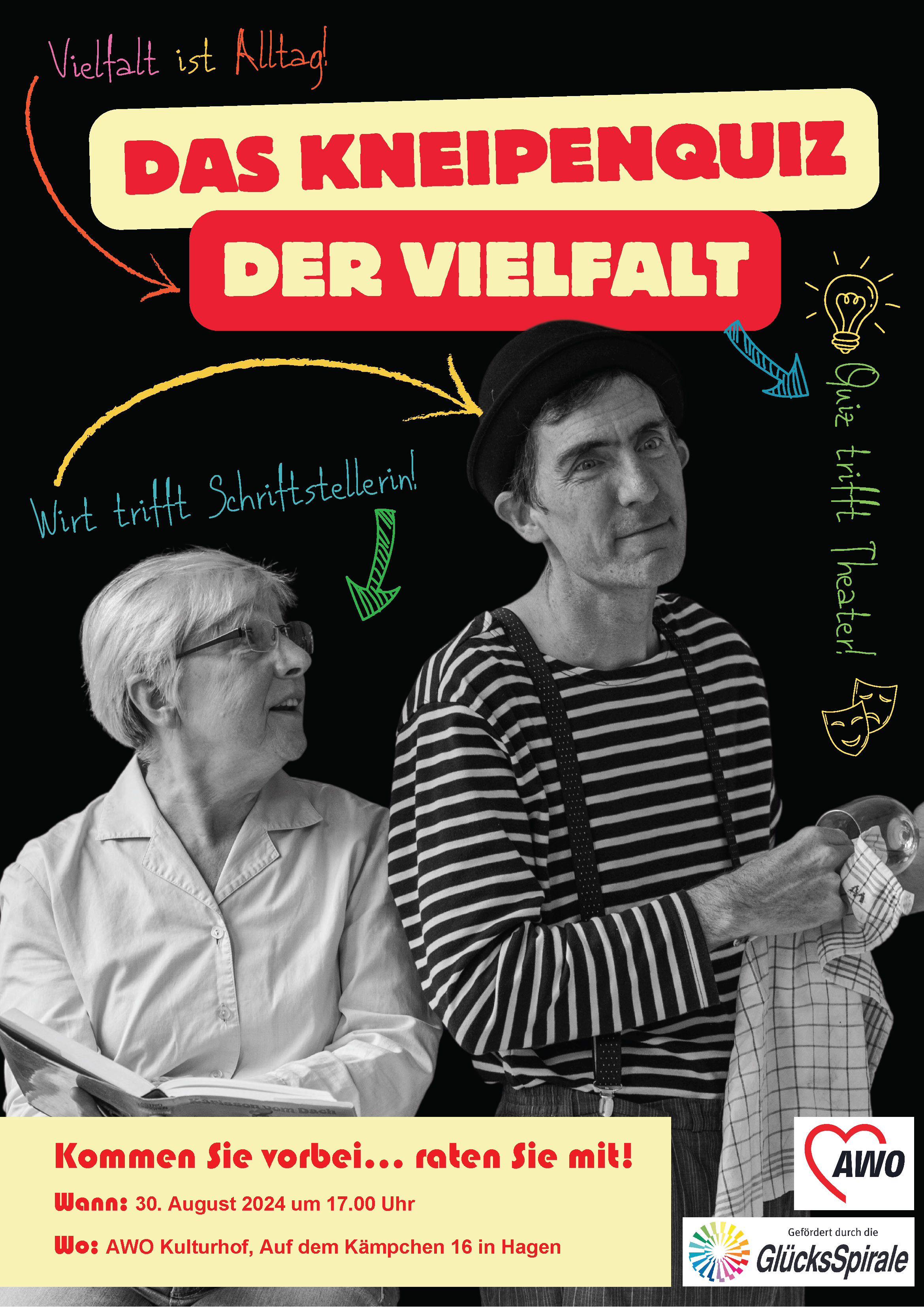 Deutschland diskutiert und die AWO reagiert. Ob Gendersternchen, Geschlechterdebatten oder bunte Gesellschaft – all das sind Themen, an denen sich die Menschen reiben. Mit einem „Kneipen-Quiz“ tourt ein Theater-Ensemble durch die AWO Ortsvereine und gastiert am Fr., 30. Aug., um 17:00 Uhr im Kulturhof Emst (Auf dem Kämpchen 16, 58093 Hagen)
