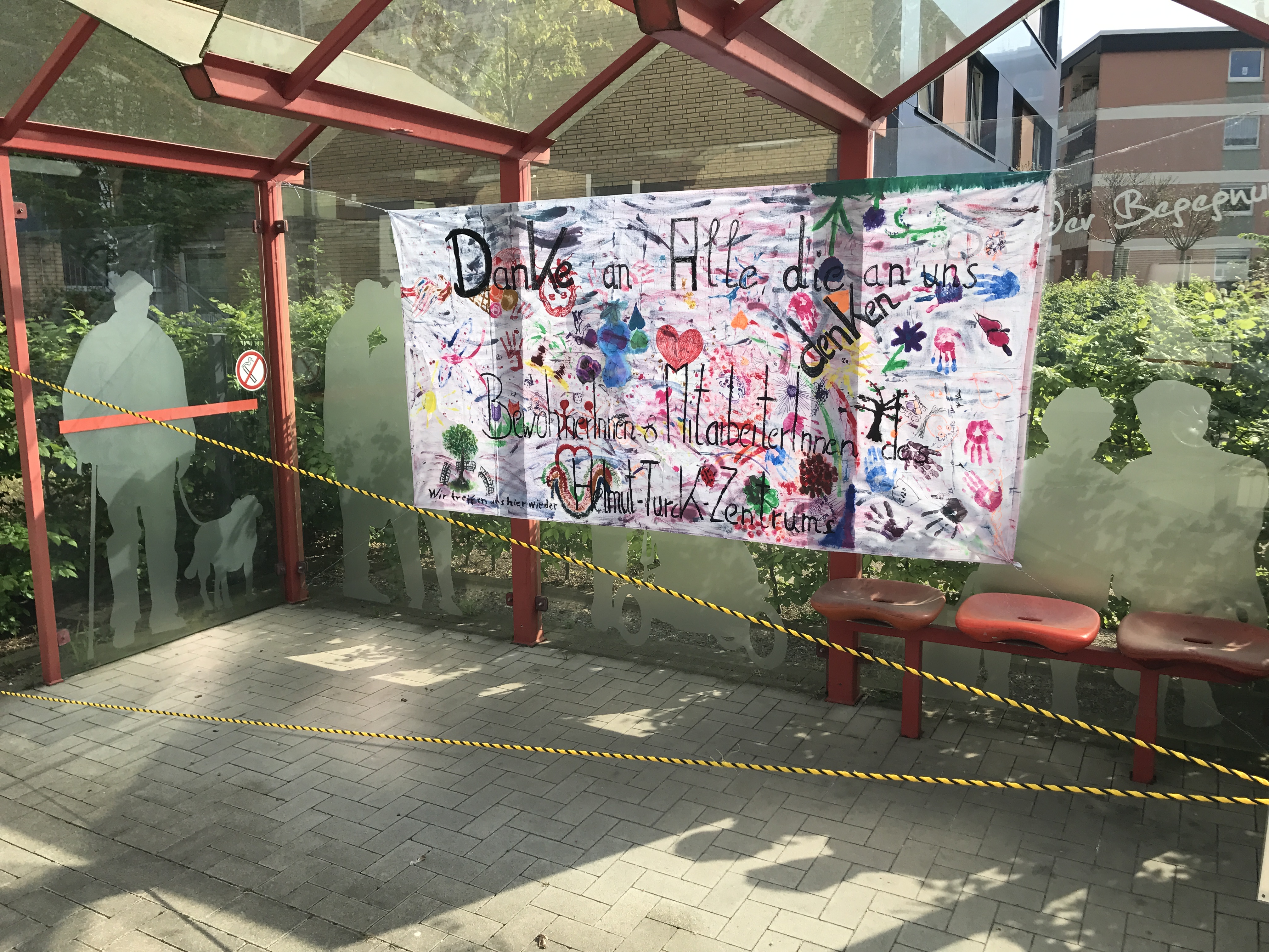 Aus diesem Grund wurde ein Plakat aufgehängt, auf dem sich Bewohner*innen und Mitarbeiter*innen auf künstlerische Art und Weise bei der Allgemeinheit bedanken.