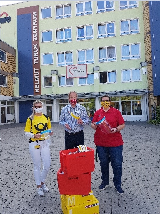 Mit großer Freude nahm die Einrichtungsleitung 50 Gesichtsschutzvisiere aus der Händen der Deutschen Post AG im Rahmen einer Spende entgegen. Auch in der Deutschen Post AG werden derzeitig weiter umfassende Schutz- und Hygienemaßnahmen umgesetzt. Aus diesem Grunde haben Auszubildende im Bereich der Betriebstechnik selbst Hand angelegt. Die benötigten Komponenten für die Gesichtsvisiere wurden teilweise mittels 3D-Druck gefertigt. Das Ergebnis ist eine hochwertige Schutzmaske, welche in bestimmten Pflegesituationen im Helmut-Turck-Zentrum zum Einsatz kommen wird.