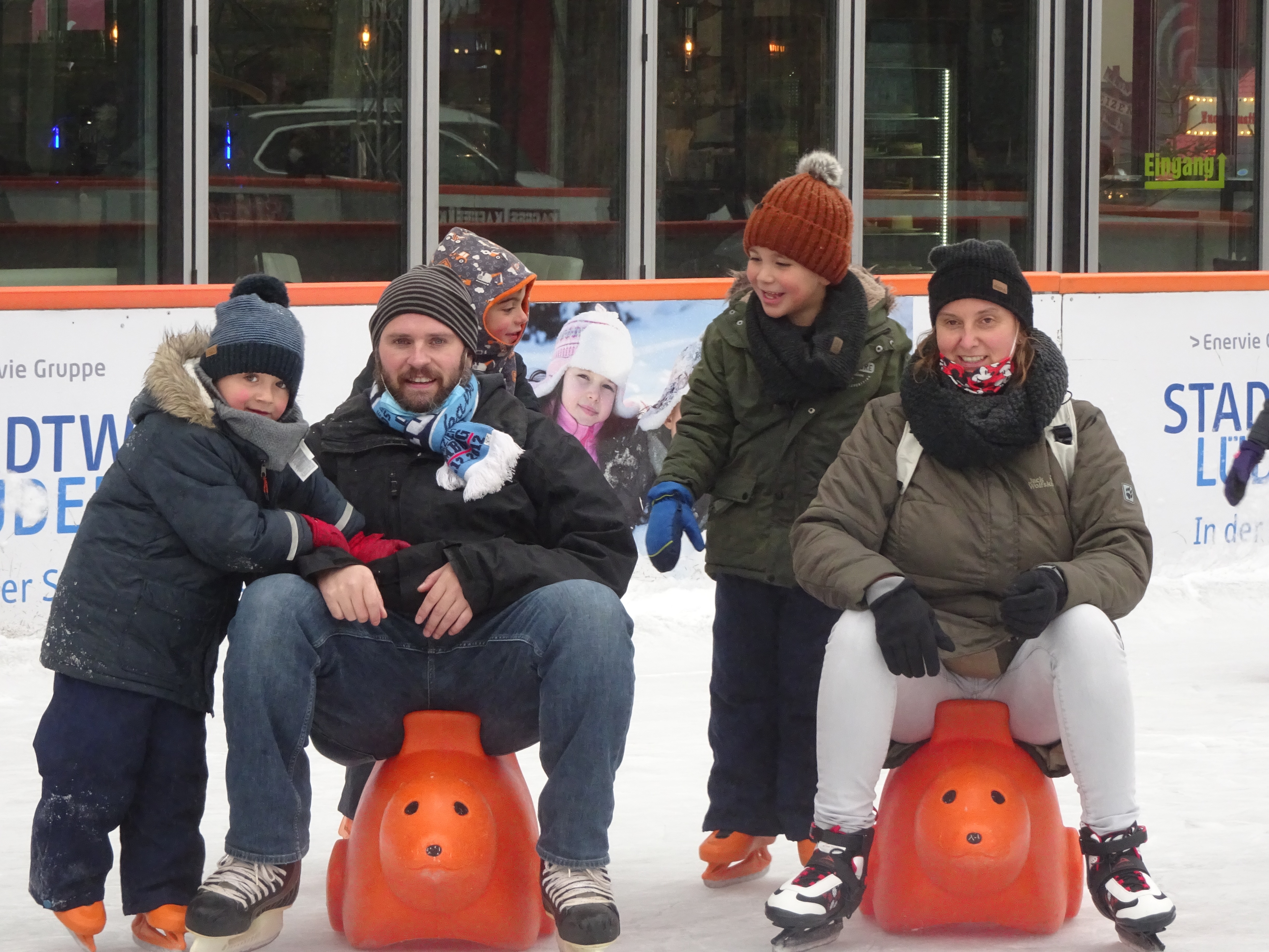 Wir waren am 23.11.2021 mit unseren 20 Vorschulkindern und einigen Eltern der Kinder in Lüdenscheid auf der Eisbahn. Diese haben wir für 1 Stunde, von 10:00 – 11:00 Uhr für unsere Kita mieten können. Es war für uns Alle eine gelungene Abwechslung im nicht immer leichten Corona Alltag. Die Kinder waren begeistert. Und wirklich jedes Kind, egal ob zum ersten Mal oder schon auf dem Eis erprobt, hat sich auf die Eisfläche getraut. Laufhilfen wurden zur Unterstützung bereitgestellt. Und auch Eltern haben sich begeistert auf die Eisfläche getraut. Warmer Kakao und Kaffee wurde neben der Eisfläche und nach dem Eislaufen getrunken und ein zweites Frühstück wurde nach dem Eislaufen verputzt. Ein gelungener Ausflug den wir im nächsten Jahr mit Sicherheit wiederholen.