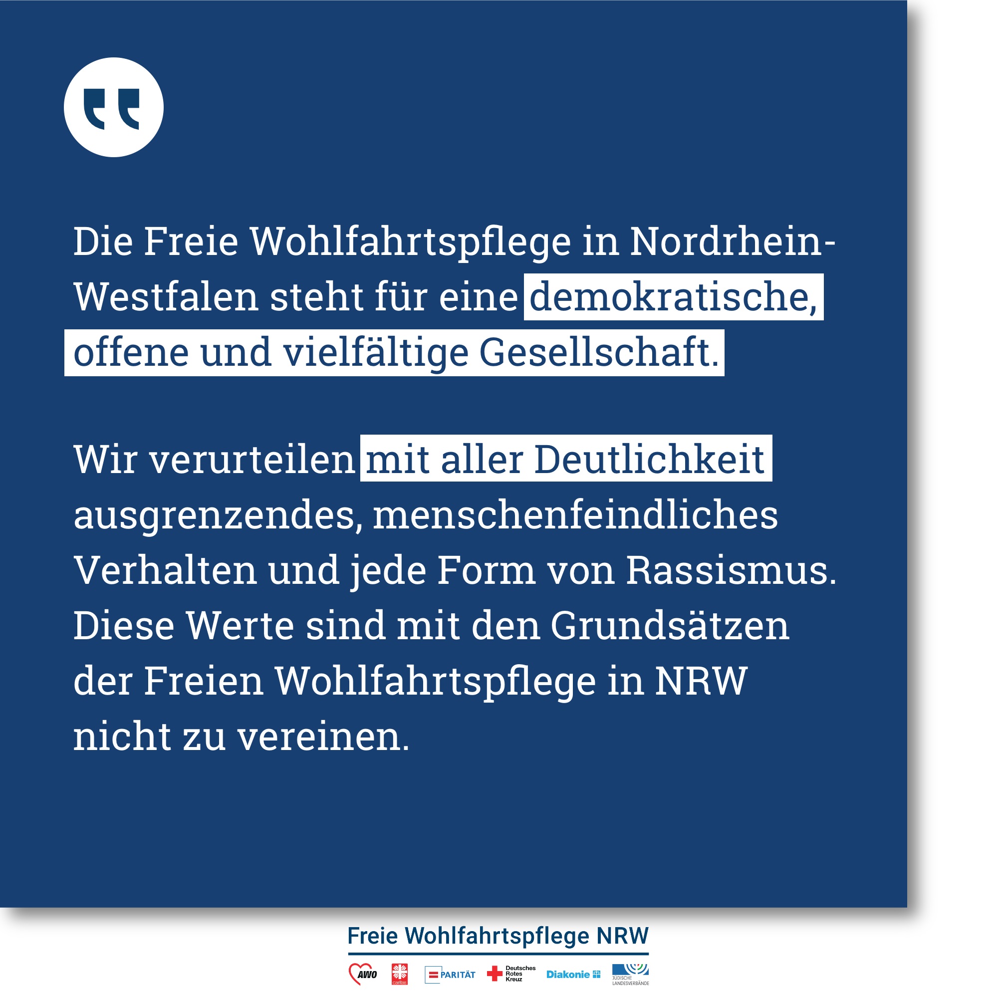 „Wie viele andere Menschen in Deutschland bin ich zutiefst beunruhigt über die aktuellen Ereignisse in Potsdam. Vertreibung und Deportation als politischen Weg auch nur in Betracht zu ziehen, verbietet sich. Die Freie Wohlfahrtspflege in Nordrhein-Westfalen setzt sich für eine vielfältige und diskriminierungskritische Gesellschaft ein und verurteilt jede Form von Rassismus. Die Verbände der Freien Wohlfahrtspflege in NRW stehen für gelebte Demokratie und eine Kultur des wechselseitigen Respekts in der Gesellschaft. Die Würde des Menschen ist der Kompass unseres Handelns. Vielfalt zu leben und sie zu gestalten, das ist die Aufgabe der Wohlfahrtsverbände in einer globalisierten Einwanderungsgesellschaft. Wir positionieren uns daher klar, wenn Menschenrechte bedroht oder missachtet werden. Wir stehen fest an der Seite derer, die nach Deutschland migriert sind. Wir verurteilen mit aller Deutlichkeit ausgrenzendes, menschenfeindliches Verhalten und jede Form von Rassismus. Diese Werte sind mit den Grundsätzen der Freien Wohlfahrtspflege in NRW nicht zu vereinen. Wir werden menschenverachtende, rechtspopulistische und rechtsextreme Haltungen und Handlungen daher auch weiterhin deutlich verurteilen und ihnen keinen Raum in unseren Einrichtungen, Angeboten und Strukturen der Freien Wohlfahrt geben. Gemeinsam treten wir für eine offene, vielfältige und demokratische Gesellschaft ein und appellieren an jeden, sich ebenso dafür zu engagieren.“