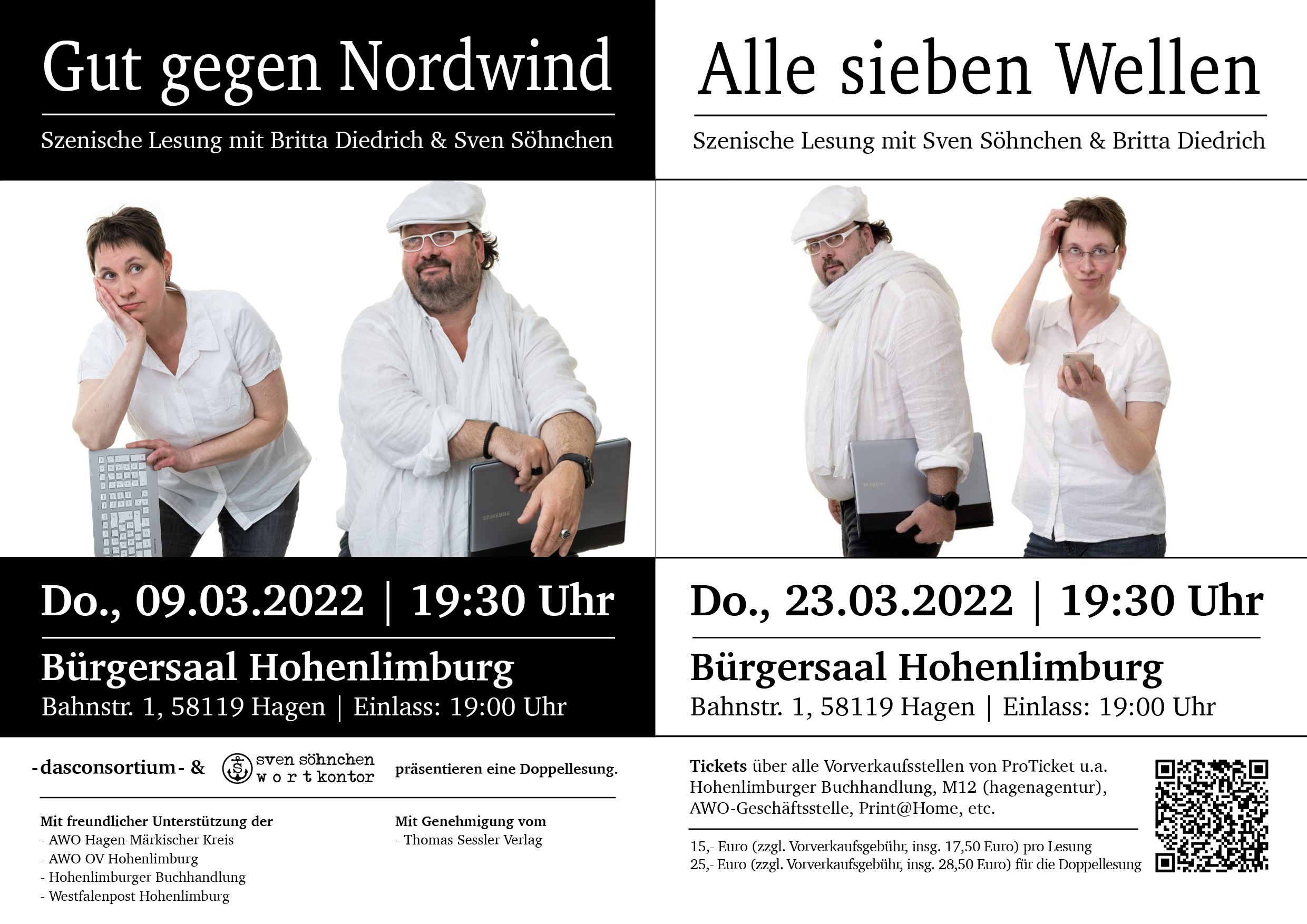 Auf Initiative der Arbeiterwohlfahrt (AWO) kommt man im März 2023 in den Genuss, die beiden Lesungen in unmittelbarer zeitlicher Nähe erleben zu können. Jeweils Donnerstagabends, am 09. und 23. März 2023, werden Britta Diedrich und Sven Söhnchen um 19:30 h im Hohenlimburger Bürgersaal (Bahnstr. 1, 58119 Hagen – direkt gegenüber dem Hohenlimburger Bahnhof) die gelesene Bühnenfassung vortragen. Die beiden engagierten Hagener verzichten dabei auf ihre Gage und spenden den Gewinn der Abende an zwei Hohenlimburger Sozialeinrichtungen. Die Erlöse der zwei Aufführungsabende werden zu gleichen Teilen an die Hochwasserhilfe der Arbeiterwohlfahrt und den Verein „Wir in Hohenlimburg“ weitergeleitet. Für die Vollblutschauspielerin Diedrich ist es eine Danksagung an das oftmals ehrenamtliche Sozialleben in ihrer Heimatstadt. „Nur durch den gelebten Zusammenhalt in der Gesellschaft, kann eine Stadt zur Heimat werden. Für uns ist es ein Beitrag, zu diesem Heimatgefühl unseren Beitrag zu leisten“, so die gebürtige Emsterin Diedrich.