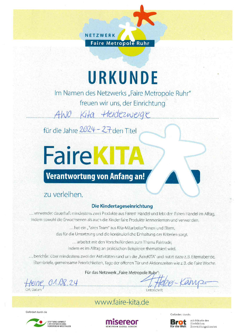 Die AWO-Kita Heidezwerge Familienzentrum Boelerheide hat jetzt für weitere drei Jahre vom Netzwerk Faire Metropole Ruhr und dem Förderkreis FaireKITA e.V. im Ruhrgebiet das Zertifikat „Faire Kita“ erhalten: Durch die Verwendung von fairen Produkten in der Einrichtung übernimmt das Team Verantwortung für einen fairen und nachhaltigen Konsum, und die Kinder lernen in der „Fairen Kita“ Zusammenhänge kennen, die ihr Verständnis einer globalisierten Welt und ihr Gerechtigkeitsempfinden schärfen.