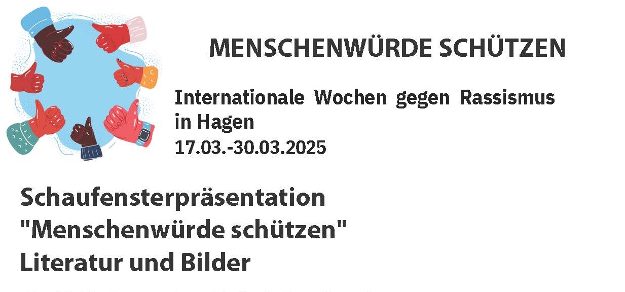 Die Integrationsagenturen der, AWO, Caritas und Diakonie in Hagen veranstalten vom 17.03. – 30.03.2025 eine Schaufensterpräsentation in Kooperation mit Hagener Buchhandlungen, der Stadtbücherei Hagen und der Volme Galerie. Es sind Bilder von Kindern der Janusz-Korczak-Schule, der Emil-Schumacher-Schule und der Sekundarschule Altenhagen und Bücher zum Thema „Menschenwürde schützen“ zu sehen an folgenden Orten: Buchhandlung am Rathaus, Buchhandlung Lesen & Hören, Comic Centrum Hagen, Quadrux Buchladen, Stadtbücherei Hagen, Thalia Hagen und in der Volme Galerie.