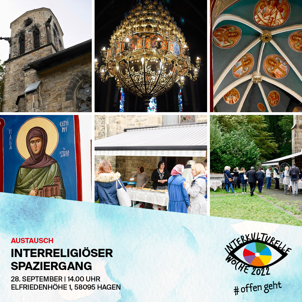 Der Spaziergang startet um 14:00 Uhr an der Elfriedenhöhe 1, 58095 Hagen – griechisch-orthodoxe Kirche. Im Anschluss besuchen die Teilnehmenden die Synagoge in der Potthofstraße. Um 16:30 findet sich die Gruppe auf dem Friedrich- Ebert- Platz ein, wo ein Netzwerk Hagener Religionsgemeinschaften und Kulturvereine das interreligiöse Friedensgebet veranstaltet. Abschließend besuchen die Teilnehmenden die Al-Siddieq Moschee in der Fehrbelliner Straße. Gegen 19 Uhr endet der ca. 3 km lange interreligiöse Spaziergang.
