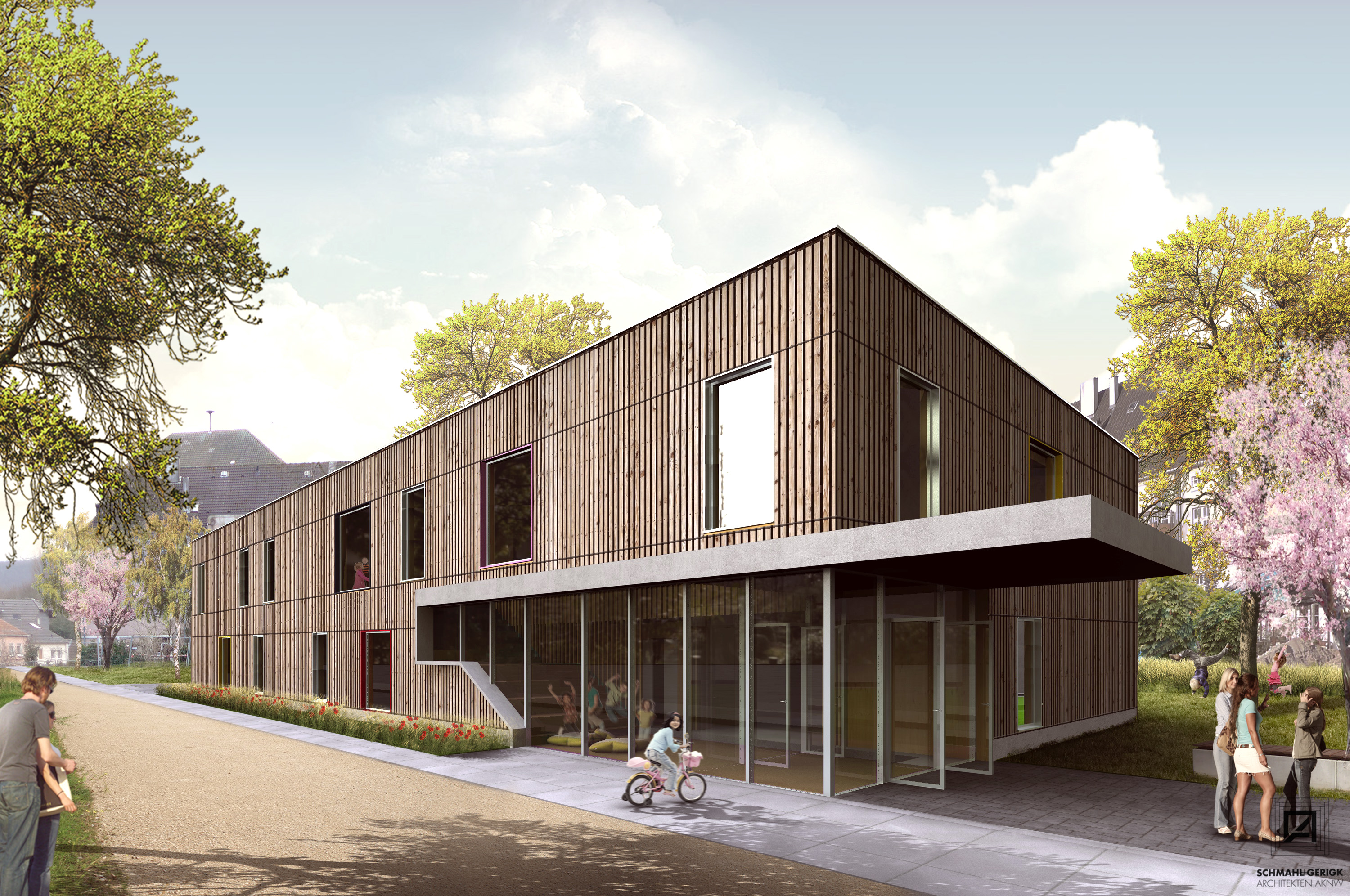 Die neue AWO-Kita entsteht zentral in einem Wohngebiet zwischen Mehrfamilienhäusern und einer Mehrgenerationenanlage. Ihre helle und kindgerechte Architektur wird aktuellen pädagogischen Ansprüchen genügen. Die Umgebung ist verkehrsberuhigt und dank einer fußläufig erreichbaren Bushaltestelle dennoch gut an die Innenstadt angebunden. Ein weiterer Vorteil ist die Nähe zum Funkepark, der beispielsweise für Außenaktivitäten genutzt werden kann.