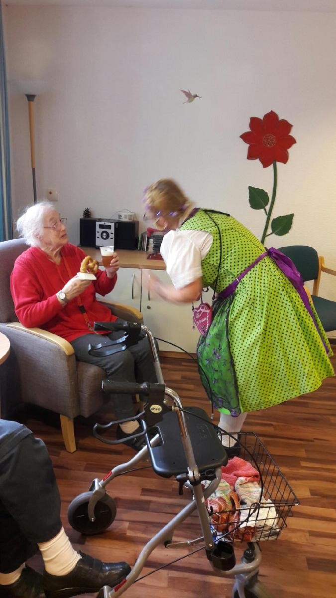 Und damit die Bewohner*innen in diesen Zeiten nicht auf alles verzichten müssen, wurde kurzum etwas Anderes angeboten. Zwei Mitarbeiterinnen zogen sich ein klassisches Dirndl an und boten den Bewohner*innen somit auch noch etwas Schönes für das Auge, während sie mit einem bajuwarisch geschmückten Wagen durch die Einrichtung fuhren. Und das alles selbstverständlich unter der Einhaltung aller Hygiene- und Schutzmaßnahmen. Gleichzeitig wird aktuell eine bayrische Mottowoche zum Speiseplan angeboten. Weißwürstchen, Schweinshaxe, Leberkäse und viele andere Köstlichkeiten mehr werden allen Bewohner*innen in dieser Woche zum Essen angeboten. `Denn Lust und Wohlgefühl geht ja bekannter weise durch den Magen`.