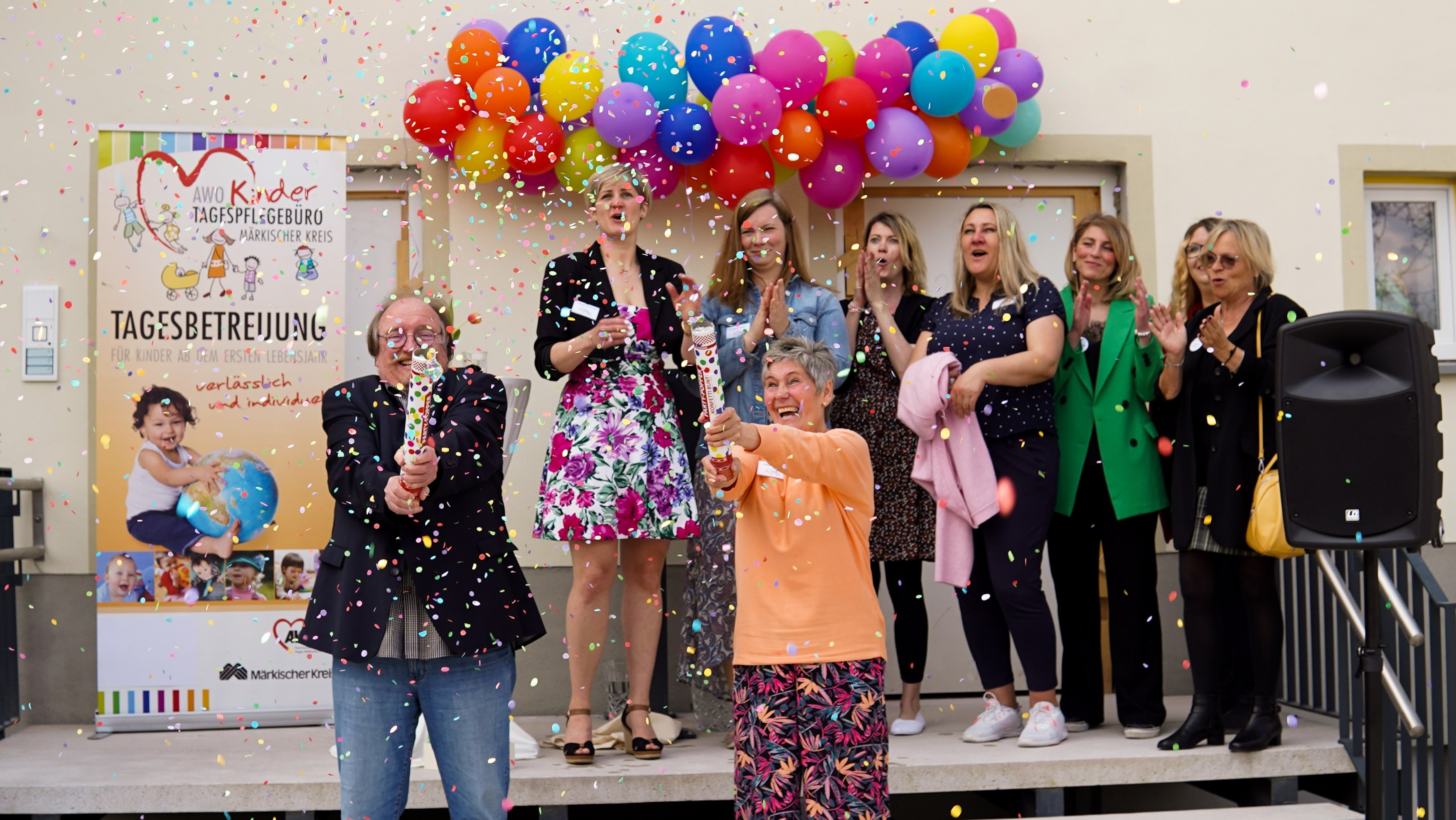 Passend zum Namen der neuen AWO-Einrichtung in Meinerzhagen posierten in einem Konfettiregen Lilian Tanzius, die Leiterin des AWO-Kindertagespflegebüros und ihre Mitarbeiterinnen für das Eröffnungsfoto mit Kreis-Fachdienstleiter Matthias Sauerland: Die Großtagespflegestelle „Konfetti Kitz“ und das Kindertagespflegebüro finden in den neuen Räumlichkeiten an der Hauptstraße nicht nur optimale Bedingungen für die Betreuung der Kinder; die von der Meinerzhagener Baugesellschaft sorgfältig sanierten Gebäude werten zudem das Stadtbild auf.
