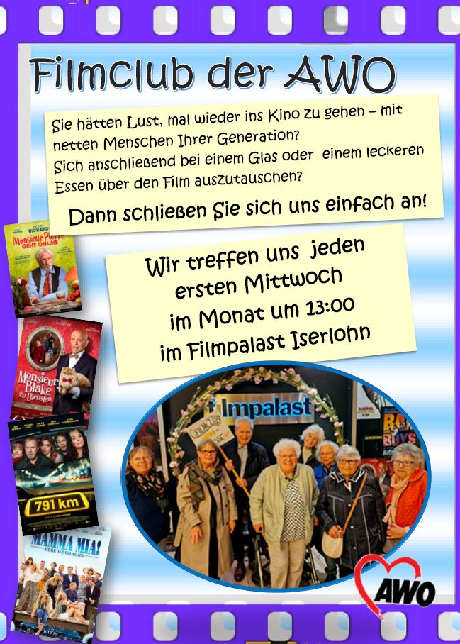 05.08.2024Unser Filmclub trifft sich jeden 1. Mittwoch im Monat um 13 Uhr im Filmpalast Iserlohn (Kurt-Schumacher-Ring 1-3, 58636 Iserlohn). Jeder ist herzlich Willkommen.