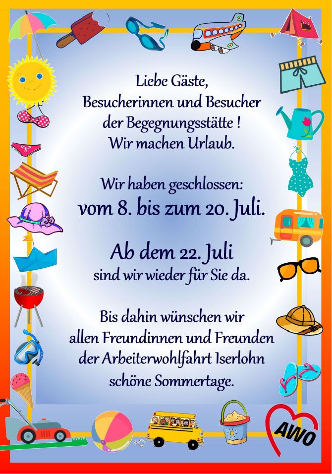12.07.2024Unsere Begegnungsstätte in Iserlohn verabschiedet sich in die Sommerpause. Ab dem 22. Juli geht das Programm weiter!