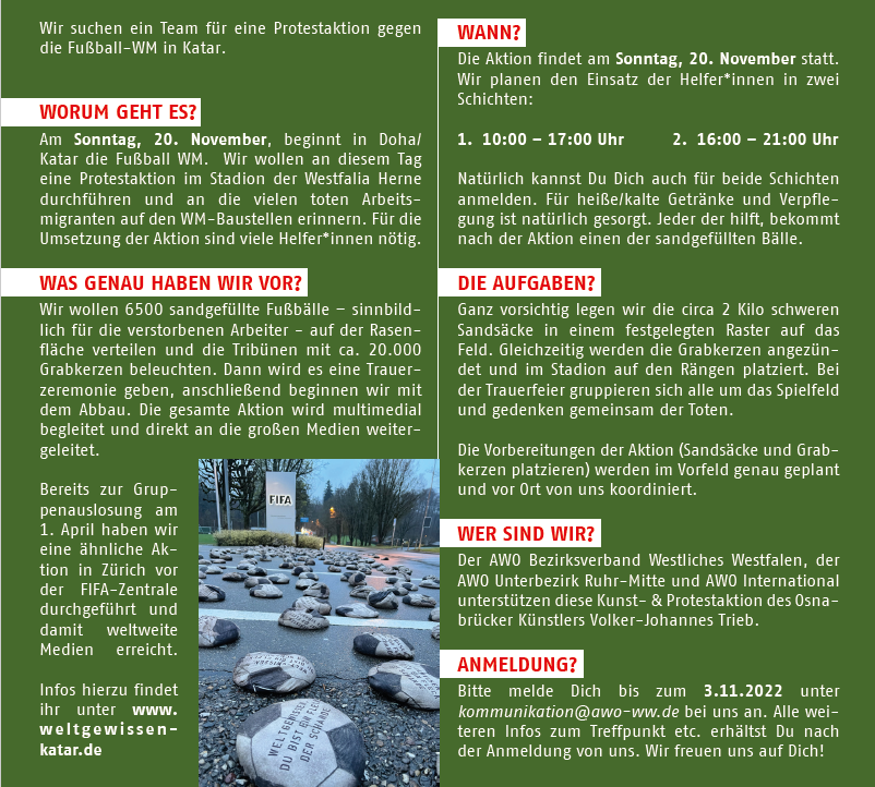 „Für uns als Arbeiterwohlfahrt sind Menschenrechte unverhandelbar. Das Leben der Arbeitsmigranten ist wichtiger als jeder Profit. Mit unserer Aktion wollen wir der Fußballwelt ins Gewissen reden und an die Grausamkeiten erinnern, die sich im Vorfeld der Weltmeisterschaft ereignet haben. Sportliche Ereignisse dürfen nie wieder an Gastgeber vergeben werden, die gegen grundlegende Werte verstoßen. “, erklärt Michael Scheffler, Vorsitzender des AWO Bezirks Westliches Westfalen.