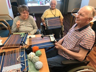 Auf Grund des weiteren Ausfalls von Festen und Feiern im Hinblick auf die weiter anzuwendenden Corona-Schutzmaßnahmen haben sich Mitarbeiter*innen der Betreuungsassistenz etwas Anderes überlegt. Die Webrahmen wurden ausschließlich aus recycelten Materialien zusammengebaut. Dieses übernahm eine Mitarbeiterin zu Hause, so dass mit der Arbeit schnell angefangen werden konnte. Das Ergebnis kann sich sehen lassen. Die Rahmen bestehen ausschließlich aus Pappe, Holz und Wolle.